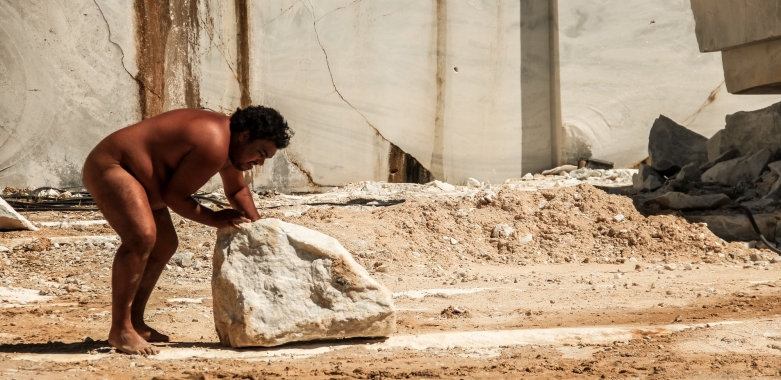 Video performance carried out in one of the marble quarries in Vargem Alta, in the interior of Espírito Santo, and results from his experience with local workers. His black body faces the almost impossible effort of carrying heavy blocks of white marble, referring to the physical and historical barriers imposed on racialized bodies. The material, associated with the nobility of the sculpture and its fine forms, here evokes oppression and exploitation through labor, whether prison or slave labor. The repetition of movements—motion, exhaustion, reinvigoration—creates a metaphor for the daily struggle against structural and racial inequalities inherited from the legacy of slavery. By converting this act into a political and poetic gesture, the artist transforms the impossibility of moving the white marble, as a weight of the colonial legacy, into the possibility of artistic creation, based on the impasses inscribed in his own personal and collective background.
